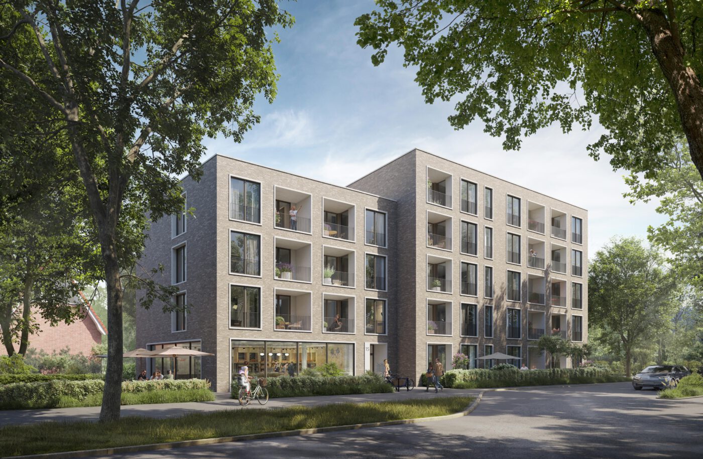 Im Erdgeschoss ist eine gewerbliche Nutzung vorgesehen, die den Straßenraum aktiviert und das Gebäude im Quartier verankert. Darüber sind 19 Wohnungen angeordnet, die überwiegend als Zwei- und Drei-Zimmerwohnungen konzipiert sind und ein differenziertes Angebot für unterschiedliche Haushaltsgrößen bieten. Sämtliche Wohnungen sind barrierefrei erschlossen und verfügen über großzügige, nach Südwesten orientierte Freisitze.